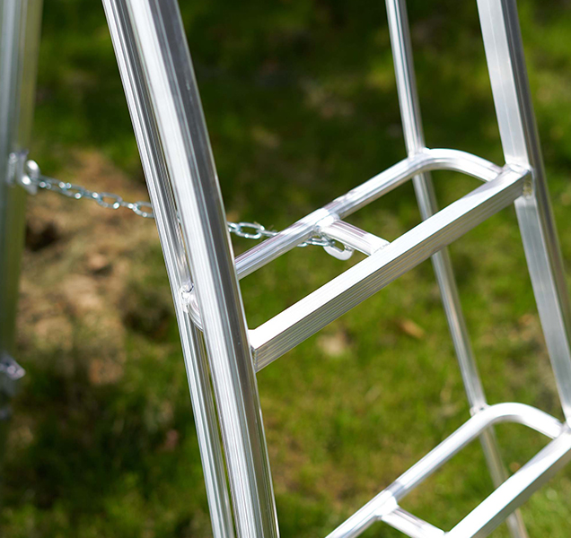 利用高強(qiáng)度耐腐蝕鐵鏈確保安全作業(yè)角度。鋼鉤搭配調(diào)節(jié)孔確保鎖定調(diào)節(jié)伸縮梯腳方便應(yīng)對不同高度作業(yè)。