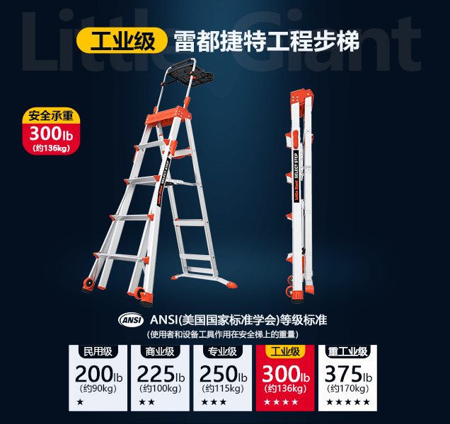 通過美國ANSI針對工業(yè)梯具安全檢測標準的工業(yè)級別136kg(300lb)認證