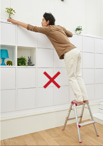 - 在梯子上進(jìn)行作業(yè)時(shí),請(qǐng)站在從天板開始數(shù)第三節(jié)(210cm以下的型號(hào)則為第二節(jié))以下的踏板上,身體輕靠天板和上層踏板,在平穩(wěn)的狀態(tài)下操作。